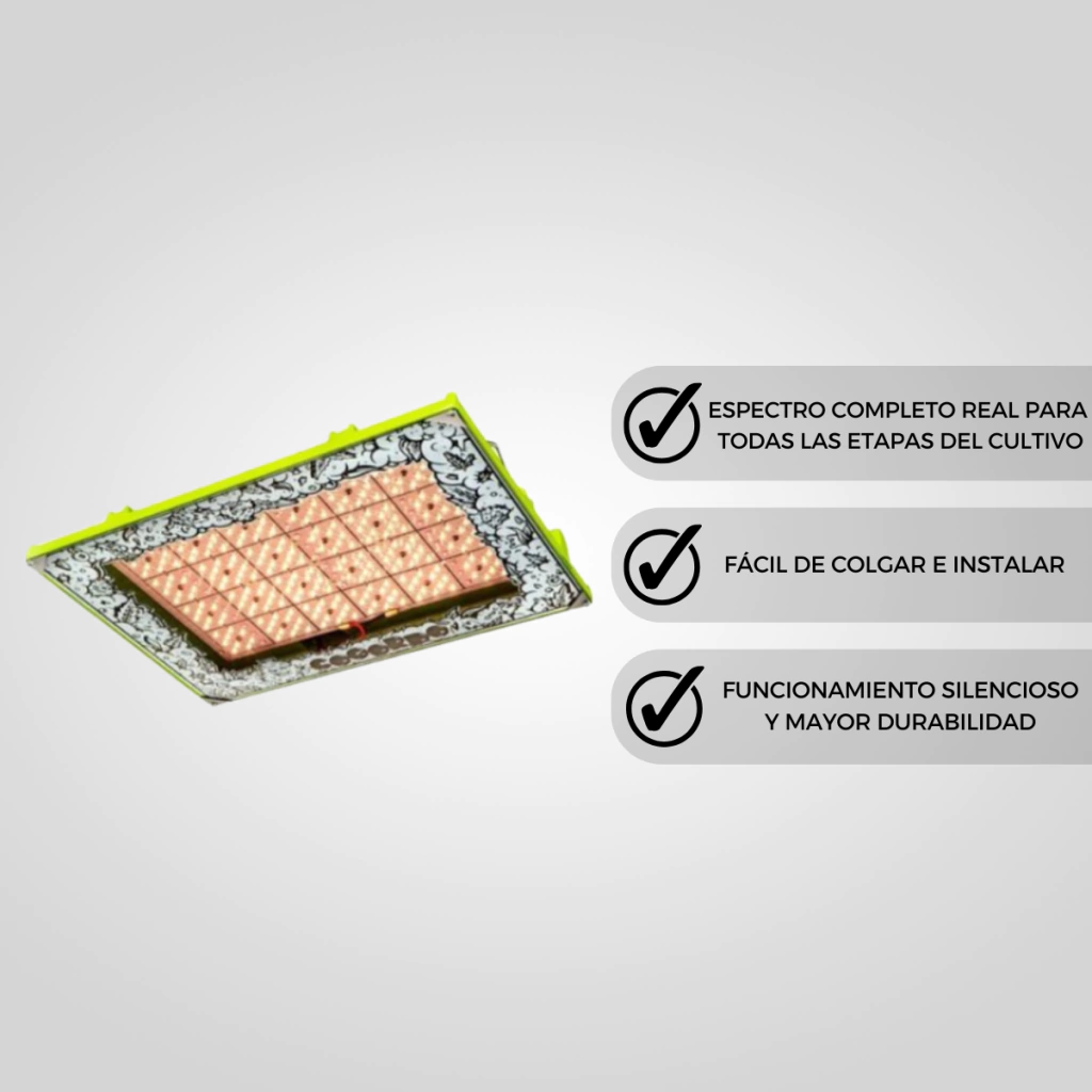 Cuenta con led OSRAM linea Duris de 3000K y CRI 80 y con suplemento de leds rojos 660nm para potenciar los resultados en floracion.