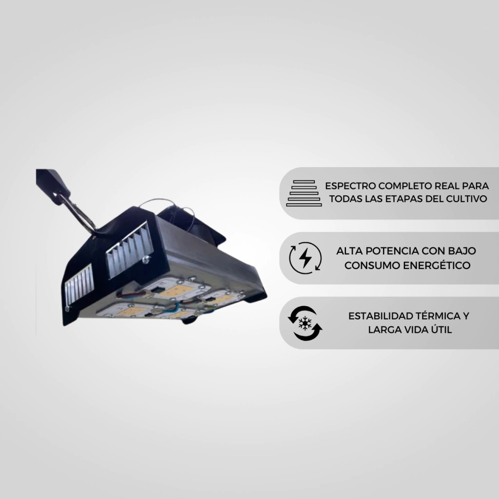 Es una opción accesible y potente para cultivadores que buscan resultados profesionales sin pagar de más. Su espectro completo permite simplificar el esquema lumínico con un solo equipo, y su bajo consumo lo convierte en una inversión inteligente a largo plazo. La estructura robusta y su sistema de refrigeración garantizan durabilidad y rendimiento constante.