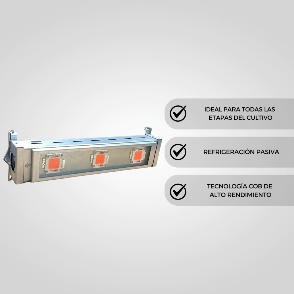 Porque ofrece potencia, espectro y eficiencia profesional en un formato compacto. Los chips COB generan una luz intensa y profunda, favoreciendo una floración abundante y una estructura vegetal fuerte. Además, su diseño sin ventiladores lo hace seguro, silencioso y de bajo mantenimiento, ideal para espacios reducidos o entornos domésticos.