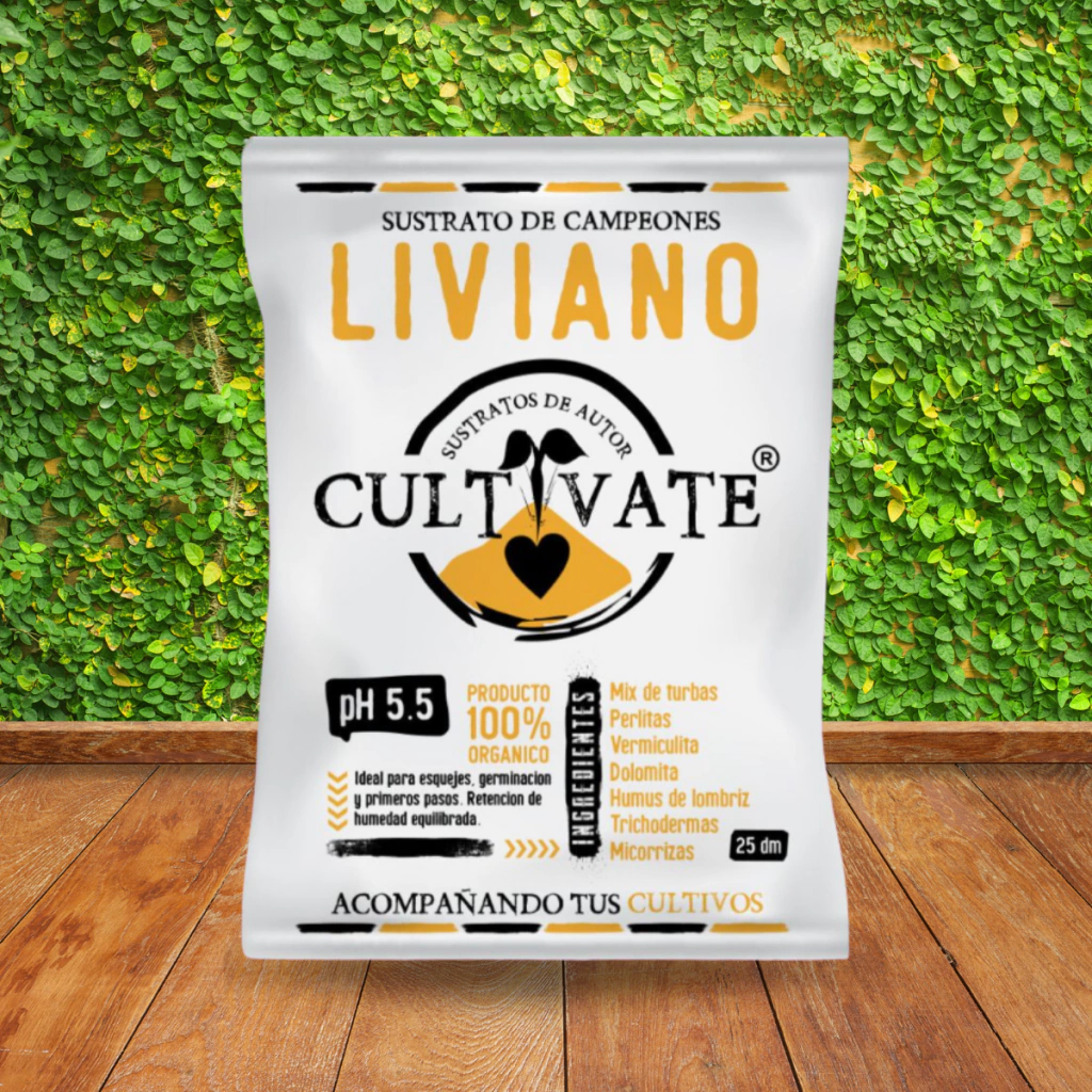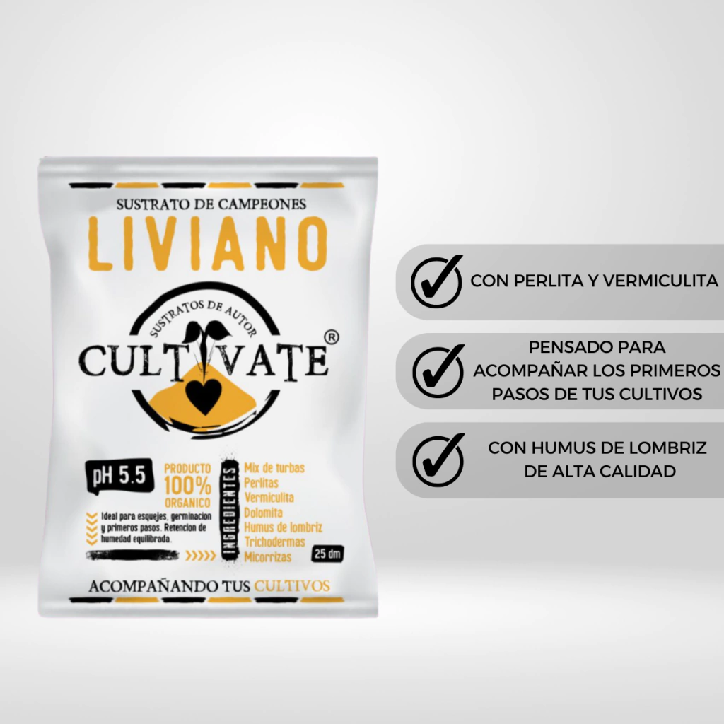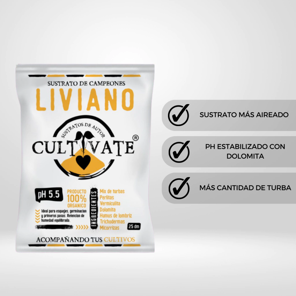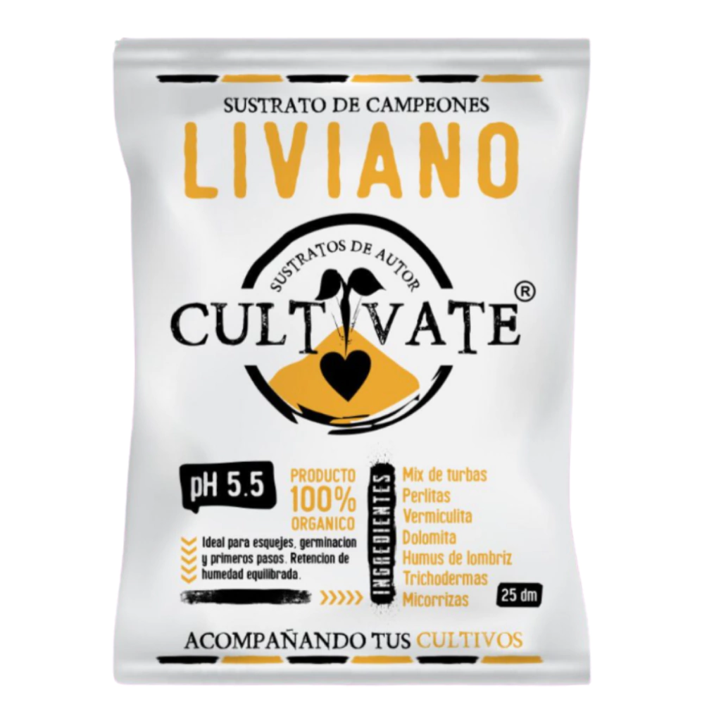 Cultivate Sustrato Liviano 25L es la mezcla ideal para esquejes y etapas iniciales del cultivo. Su fórmula aireada combina una mayor cantidad de turba con perlita y vermiculita, garantizando un pH estabilizado gracias a las dolomitas. Esto favorece un ambiente óptimo para el desarrollo radicular y la retención adecuada de humedad y aire. Perfecto para quienes buscan un sustrato liviano, aireado y eficiente en cada paso del cultivo.